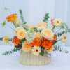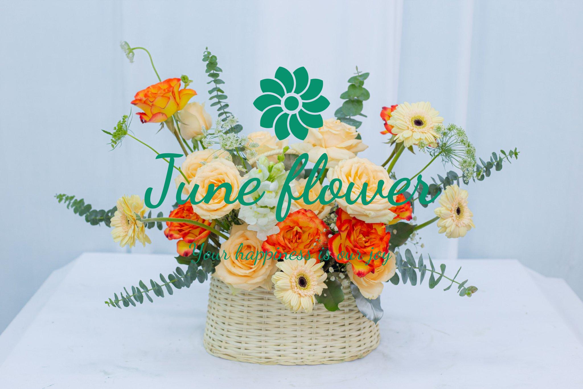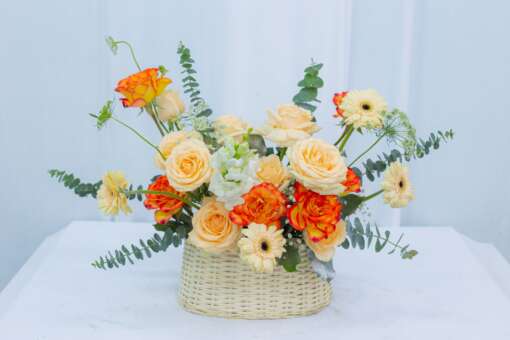 Categories: HOA GIỎ, MÀU CAM, MÀU TRẮNG, MÀU VÀNG Tags: giỏ hoa, hoa hồng cam, hoa đồng tiền, tone cam